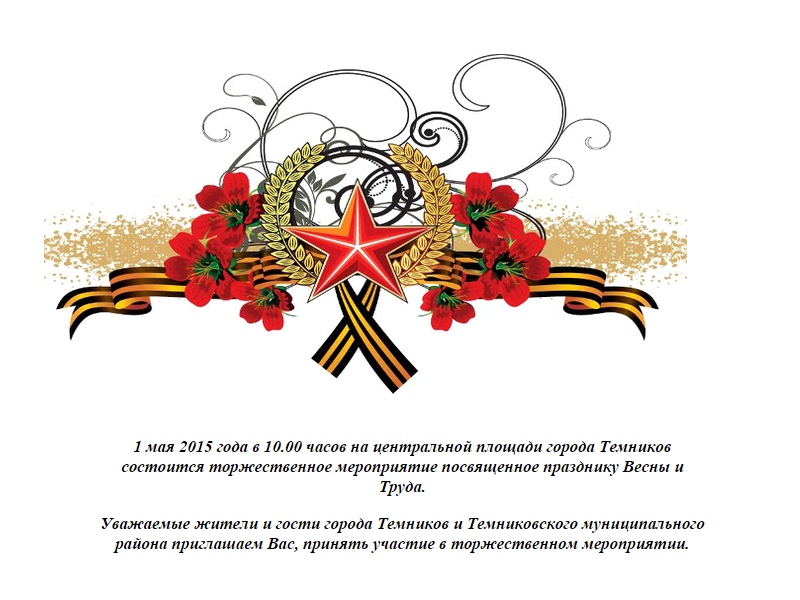 1 мая 2015 года в 10.00 часов на центральной площади города Темников состоится торжественное мероприятие посвященное празднику Весны и Труда