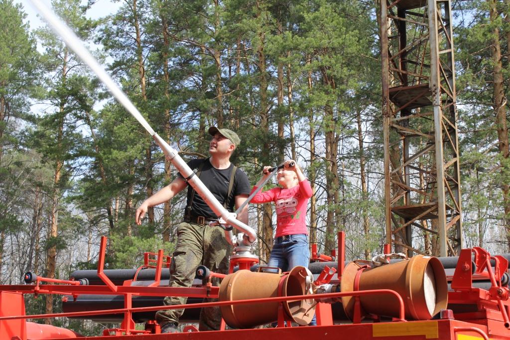 После ознакомления с техникой безопасности дети и взрослые ощутили себя настоящими пожарными: самостоятельно протягивали рукавные линии с пожарных машин, подавали воду, а также в соответствии с установленными указаниями своевременно потушили место воображаемого возгорания. В ходе занятия с начальником пожарно-химической станции участники пользовались пожарными ранцами и делали окопку мест очагов возгорания. Указания руководителя группы были выполнены своевременно и безоговорочно, как и подобает настоящим пожарным. Занятие второго дня открытых дверей закончилось аплодисментами.