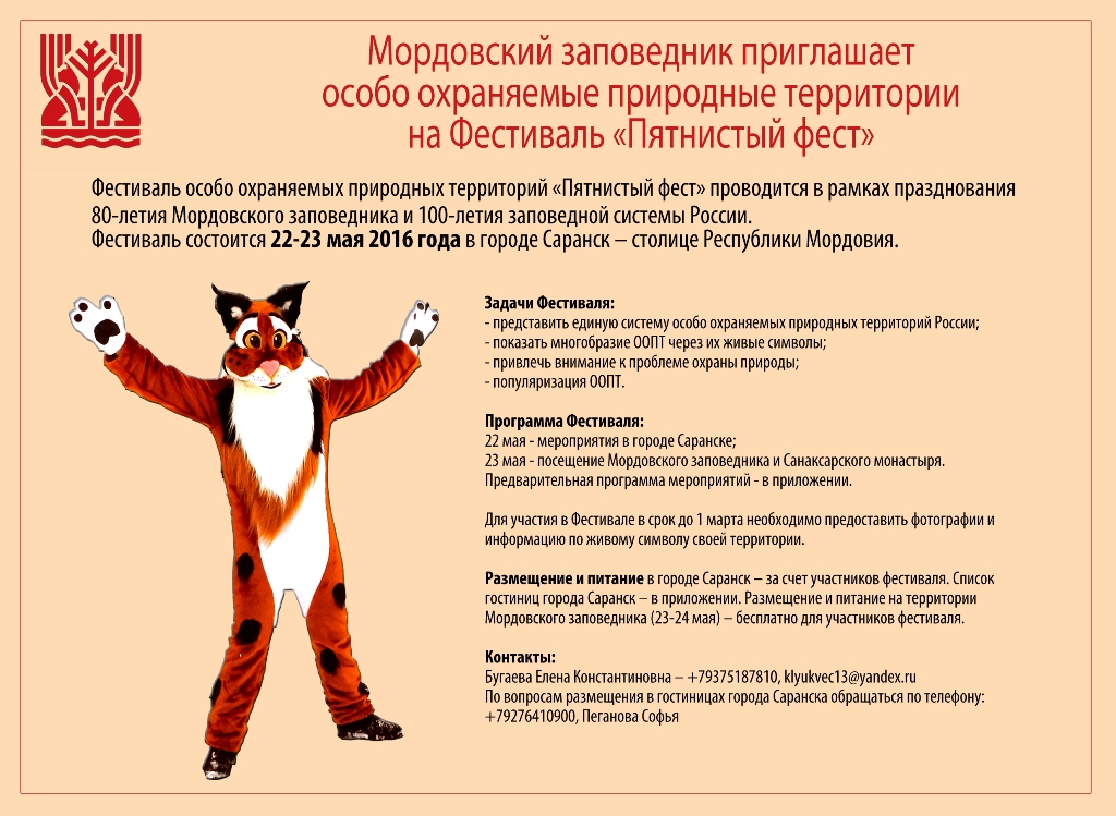 "Пятнистый фест" - фестиваль особо охраняемых природных территорий от Орла до Командор, от Хопра до Арктики, посвященный 80-летию Мордовского заповедника и 100-летию заповедной системы России. 22 мая 2016 года на площадиТысячелетия города Саранск заповедники и национальные парки России представят свои территории жителям и гостям столицы республики Мордовия. В программе фестиваля - выставка "Живые заповедные символы России", мастер-классы участников фестиваля, концертная программа, квест "С днем рождения, Мордовский заповедник!", танцевальный флешмоб.