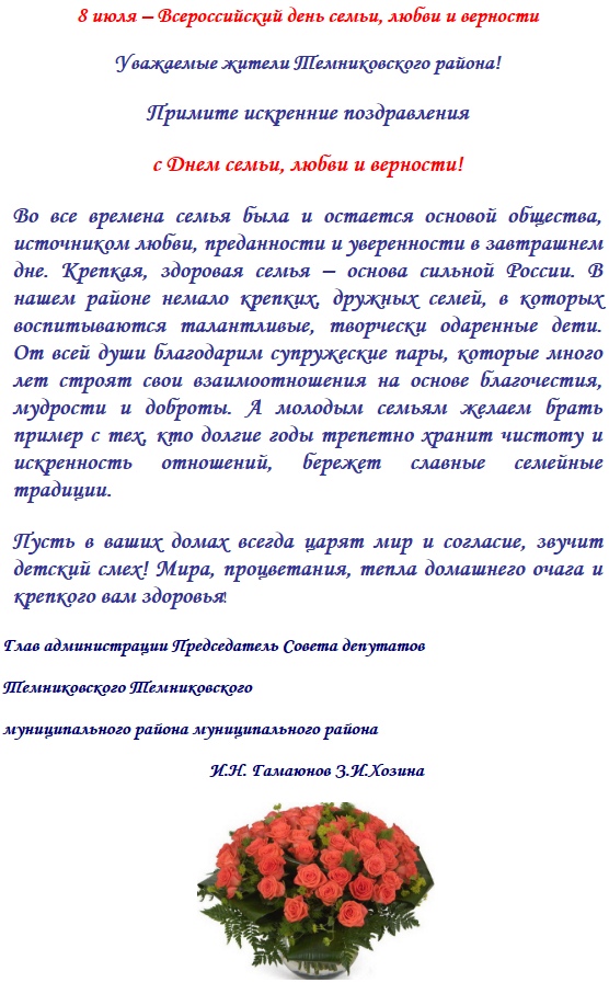 Уважаемые жители Темниковского района! Примите искренние поздравления с Днем семьи, любви и верности!