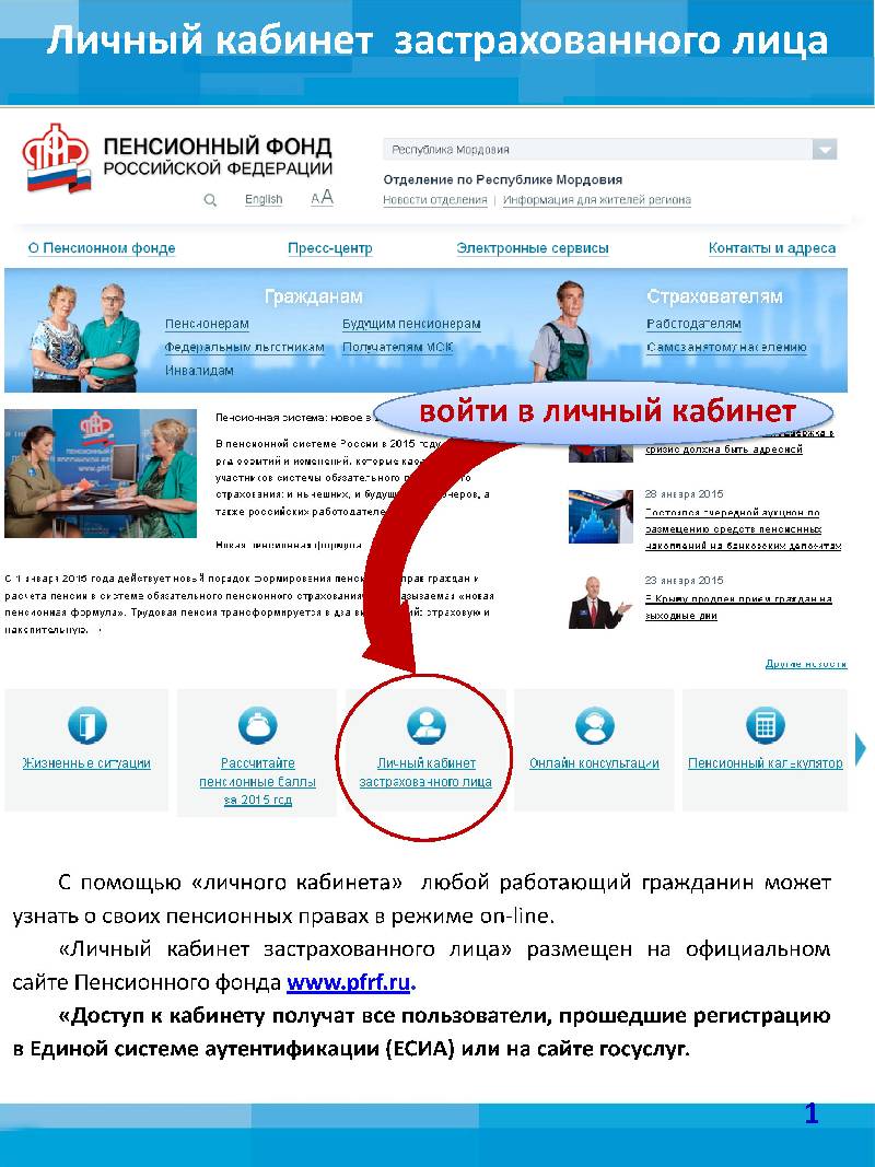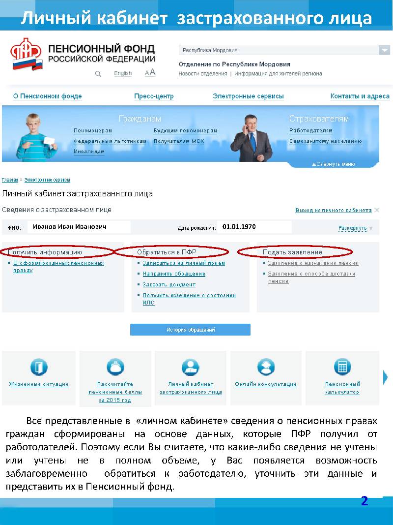 Определённый перечень услуг ПФР лица, ограниченные в возможности передвижения, могут получить и через электронный сервис Пенсионного «Личный кабинет застрахованного лица», расположенный на сайте ПФР по адресу pfrf.ru. Сегодня, зарегистрировавшись в «Личном кабинете», можно подать заявление на назначение и доставку пенсий, получить информацию о своих сформированных пенсионных правах, просмотреть состояние лицевого счета, направить обращение в ПФР и т.д.